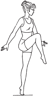 Рис. 7. Упражнение 9 10. Исходное положение: стоя, руки разведены в стороны или зафиксированы на поясе, пятки вместе, носки разведены в стороны. Поднимите левую ногу, отведя носок на себя, Задержитесь в этой позиции на 1–2 секунды, затем резко вытяните носок и вернитесь в исходное положение (рис. 8). Проделайте то же самое правой ногой. Количество повторов – 5–8 каждой ногой. В процессе выполнения упражнения можно делать кратковременные перерывы на отдых.