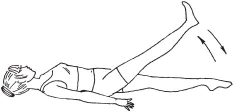 Рис. 49. Упражнение 4 5. Исходное положение: лежа на правом боку. Приподнимитесь, опираясь на локоть правой руки. Левой рукой захватите стопу левой ноги и выполняйте пружинящие движения, стараясь отвести ее дальше. Перевернитесь на левый бок и проделайте то же самое правой ногой (рис. 50).