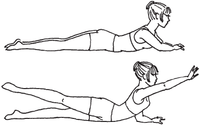 Рис. 48. Упражнение 3 4. Исходное положение: лежа на животе, упершись в пол согнутыми в локтях руками, ноги вместе. Опираясь на локоть правой руки и вытянув левую, приподнимите плечи, затем левую ногу. Задержитесь в этой позиции на несколько секунд, после чего опустите ногу и снова ее поднимите. Проделайте то же самое правой ногой (рис. 49).