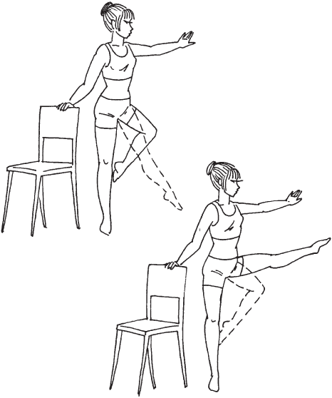 Чтобы исправить форму полных бедер, не обязательно следовать строгой диете. Чтобы они выглядели соблазнительно, достаточно регулярно выполнять специальные упражнения. 1. Исходное положение: стоя у стула, ноги вместе. Опираясь на спинку стула, сделайте мах правой ногой, стараясь поднять ее как можно выше. Вернитесь в исходную позицию и проделайте то же самое левой ногой (рис. 64). Повторите упражнение 7–10 раз каждой ногой.