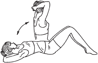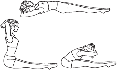 Рис. 94. Упражнение 4 5. Исходное положение: лежа на спине, руки согнуты в локтях и заведены за голову, ноги вместе. Сядьте, не упираясь руками в пол, наклонитесь вперед и коснитесь лбом коленей, затем вернитесь в исходное положение, не сгибая при этом ноги (рис. 95). Повторите упражнение 5–10 раз.
