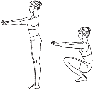 Рис. 114. Упражнение 17 18. Исходное положение: стоя, руки опущены вдоль туловища, ноги расставлены на ширину плеч. Протяните руки вперед и 10 раз медленно и глубоко присядьте. Это упражнение хорошо стимулирует кровообращение (рис. 115).