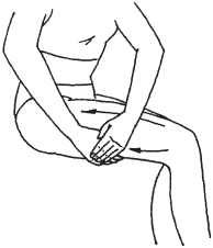 Рис. 122. Двойное кольцевое разминание внутренней поверхности бедра Одновременно на задней и передней поверхностях бедра сделайте двойное ординарное разминание (рис. 123). Для выполнения этого приема нужно сесть на стул, а массируемую ногу поставить на пол.
