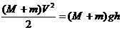 где m – масса пули, M – масса маятника, v – скорость пули, V – скорость маятника непосредственно после удара. Чтобы определить величину V, нужно измерить высоту h, на которую поднимается маятник после удара. Согласно закону сохранения энергии: в системе тел, между которыми действуют только консервативные силы (силы, работа которых не зависит от вида траектории, а определяется только начальным и конечным положением тела), полная механическая энергия сохраняется, т.е. не изменяется со временем. Из закона сохранения энергии получается, что кинетическая энергия системы маятник-пуля переходит в потенциальную энергию этой же системы: