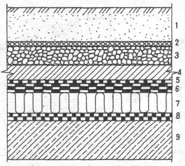 Рисунок Конструкция крыши-сада: 1 — растительный грунт; 2 — фильтрующий слой; 3 — дренажный слой; 4 — защитный слой; 5 — разделительный слой; 6 — гидроизоляция; 7 — утеплитель; 8 — выравнивающий слой и пароизоляция; 9 — несущая конструкция