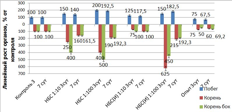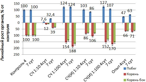 Таким образом, нами выявлено, что обработка соком Ch.majus при высоких разведениях ингибировала энергию прорастания и всхожесть семян по сравнению с контролем. Следует отметить, что БНЧ серебра снижало рост-ингибирующие действие и самого сока Ch.majus при малом разведении, которое, по-видимому, было обусловлено его токсичностью.