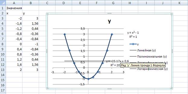 5. В данном примере заданные значения описываются зависимостью вида: y=x^2-1, т.к. коэффициент достоверности R^2=1.