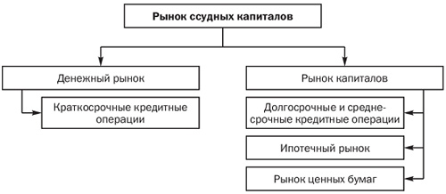 Рынок ссудных капиталов — это специфическая сфера товарных отношений, где объектом сделки является предоставляемый в ссуду денежный капитал и формируется спрос и предложение на него. С функциональной точки зрения рынок ссудных капиталов представляет собой систему рыночных отношений, обеспечивающих аккумуляцию и перераспределение денежных капиталов в целях обеспечения кредитования экономики. С институциональной точки зрения рынок ссудных капиталов представляет собой совокупность кредитно-финансовых учреждений, организаторов торговли и других учреждений рынка ценных бумаг (РЦБ), через которые осуществляется движение ссудного капитала. Структура рынка ссудного капитала представлена на рис. 10.2.