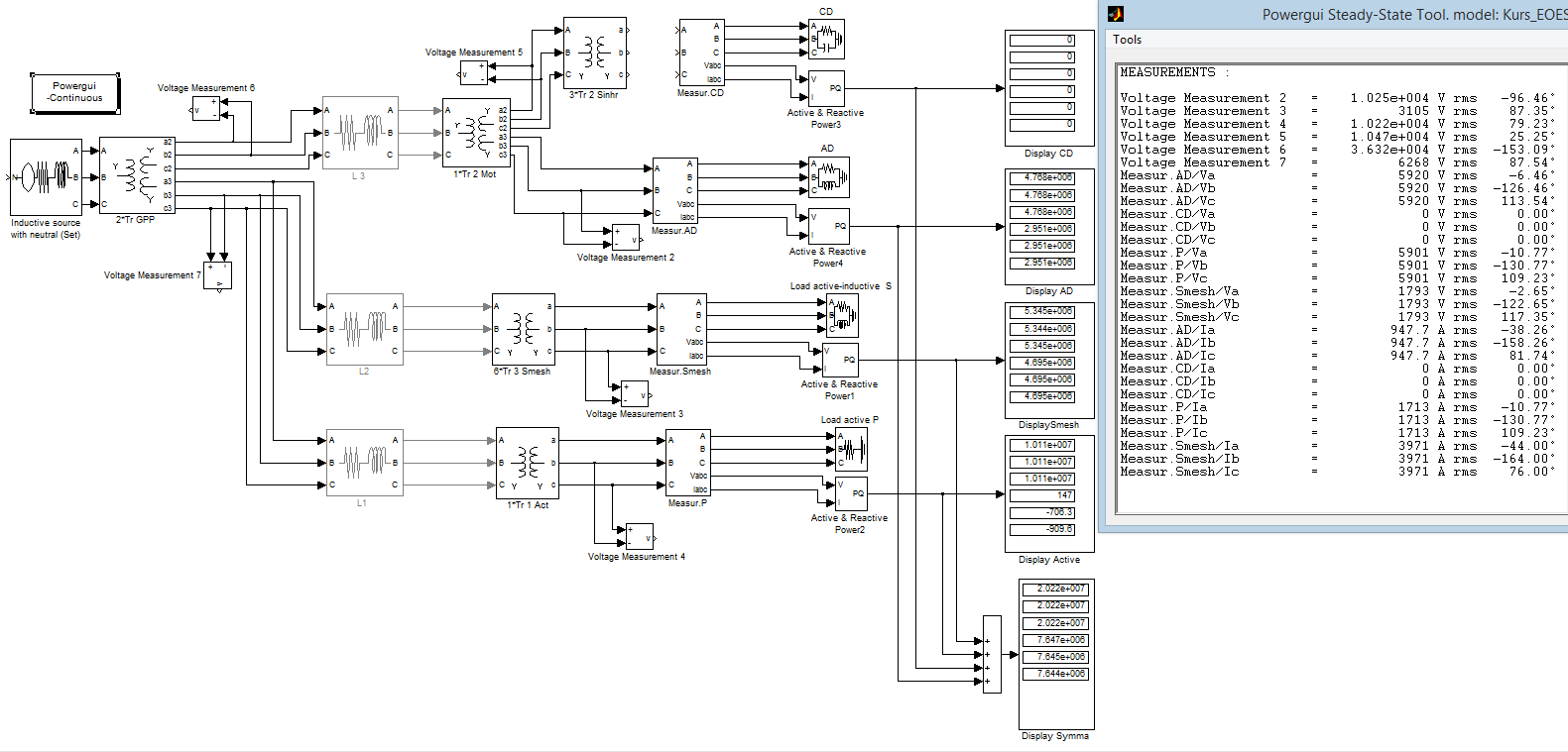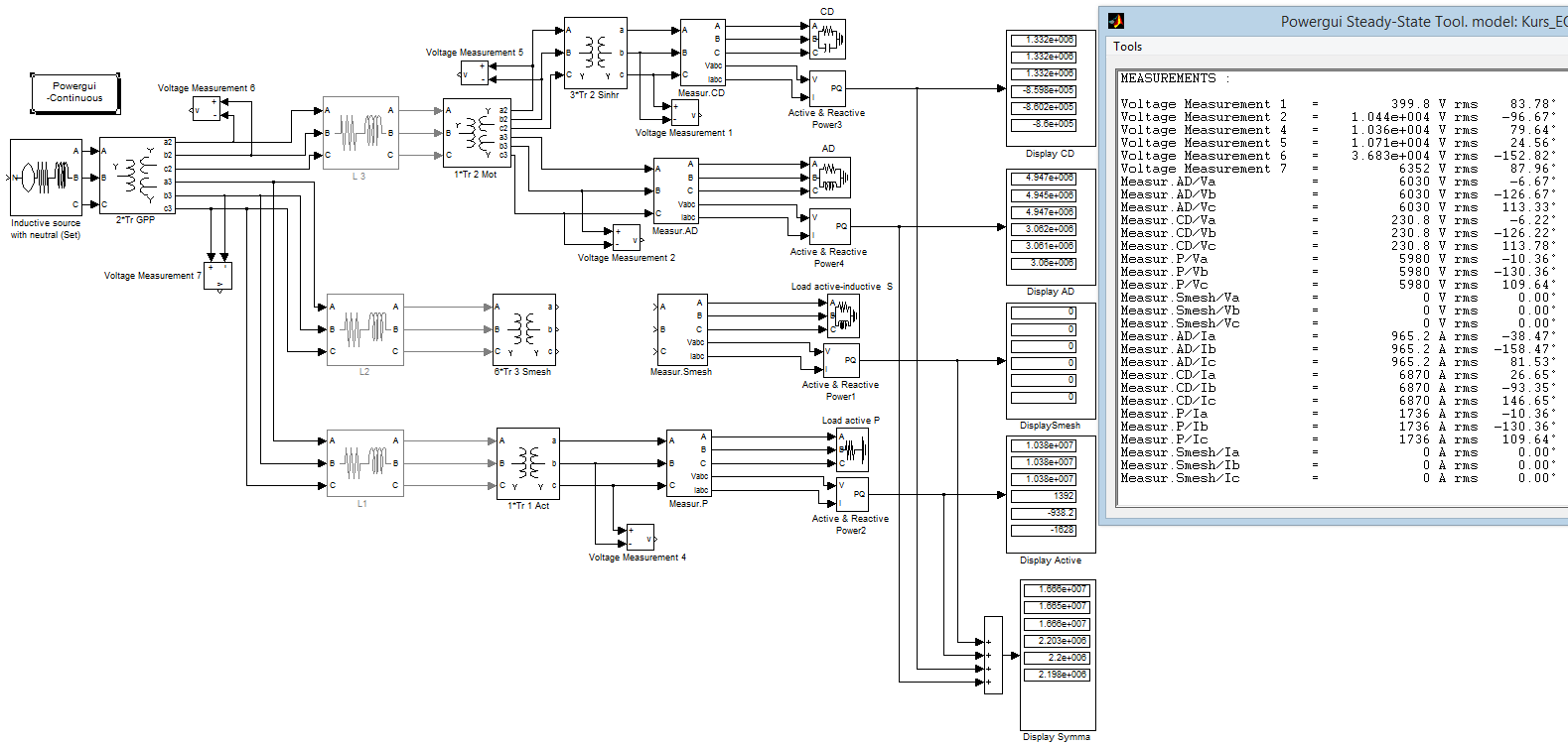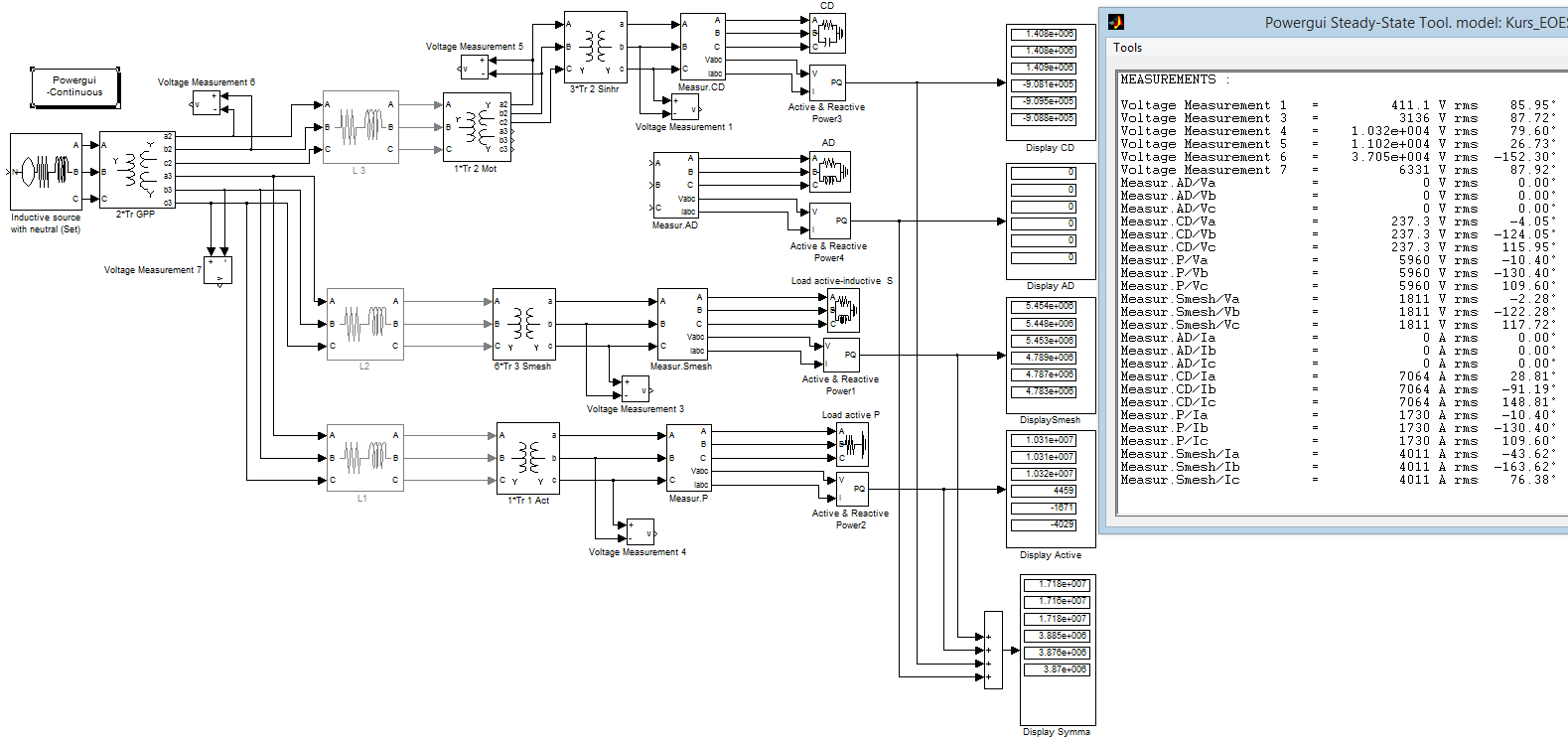 Рис.5 – Виртуальная модель «Matlab» участка схемы электроснабжения собственных нужд промышленного предприятия (АЭС). Режим работы «нормальная эксплуатация» 3 ОПЫТЫ ДЛЯ РЕЖИМОВ РАБОТЫ ОБОРУДОВАНИЯ «НОРМАЛЬНАЯ ЭКСПЛУАТАЦИЯ», «КОРОТКОЕ ЗАМЫКАНИЕ НА УЧАСТКЕ СХЕМЫ», «РАБОТА С АВАРИНО ОТКЛЮЧЕННЫЙ УЧАСТКОМ СХЕМЫ» 3.1.Опыт для режима работы оборудования «нормальная эксплуатация» (рис.6) Предварительно с помощью инструмента «Powergui-Continous» вкладка «Steady-State Voltages and currents» снимем параметры по напряжениям и токам с выборкой необходимых позиций (рис.6, 7):