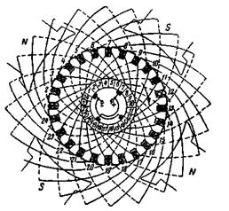 Рис. 5-12а. Радиальная схема простой петлевой обмотки (кривые вне якоря условно показывают лобовые соединения на задней стороне машины, кривые внутри якоря — лобовые соединения на ее передней стороне; см. рис. 5-12). На рис. 5-12 показаны полюсы и э.д.с, наведенные в секционных сторонах. Мы приняли, что полюсы расположены над обмоткой и что якорь относительно полюсов и щеток движется вправо. При выбранном положении якоря относительно полюсов получаются четыре параллельные ветви (2 а = 2 р = 4); они показаны на рис. 5-13, где цифрами без штриха обозначены верхние секционные стороны, а цифрами со штрихом — нижние.