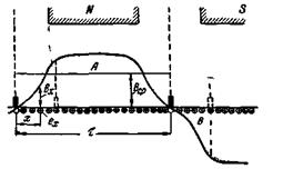 Рис. 5-20. Кривая поля и наведение э.д.с. в параллельной ветви обмотки якоря. 5-5. Магнитная цепь и ее расчет На рис. 5-21 изображена магнитная цепь машины постоянного тока. Расчет ее заключается в определении н.с., необходимой для создания в воздушном зазоре машины магнитного потока, могущего навести в обмотке якоря заданную э.д.с.