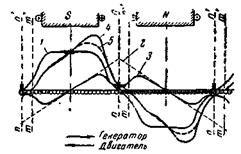 Рис. 5-24. Реакция якоря при положении щеток на геометрической нейтрали. На рис. 5-23, е показано поле машины при ее нагрузке. Мы видим, что в результате реакции якоря поле машины, работающей генератором, изменилось: произошло усиление поля под сбегающей половиной полюса и ослабление его под набегающей половиной полюса. Другим следствием реакции якоря является смещение физической нейтрали, т. е. линии, проходящей через точки окружности якоря, где индукция равна нулю. При холостом ходе физическая нейтраль совпадает с геометрической. При нагрузке она смещается относительно геометрической нейтрали: при работе генератором — в сторону вращения, при работе двигателем — против вращения (при принятых на рис. 5-23, в направлениях поля и токов в обмотке якоря машина при работе двигателем будет вращаться в обратную сторону). На рис. 5-24 показаны кривые поля машины при холостом ходе и при нагрузке: здесь также приведена кривая поля якоря. Если кривую поля машины при ее нагрузке будем определять, исходя из принципа наложения, т. е. складывая ординаты кривой поля при холостом ходе 1 и кривой поля якоря 3, то получим кривую результирующего поля 4. Однако принцип наложения здесь не может дать точных результатов, так как поле в ферромагнитных телах не является линейной функцией тока. Кривая действительного поля машины при нагрузке 5 отличается от кривой результирующего поля 4. Кривая 5 показывает, что ослабление поля под набегающей половиной полюса будет больше, чем усиление поля под сбегающей половиной полюса (вследствие насыщения главным образом зубцов якоря). В результате получается ослабление общего поля и, следовательно, уменьшение полезного потока Ф, определяющего значение э.д.с. якоря. Уменьшение э.д.с. якоря при положении щеток на геометрической нейтрали также вызвано смещением физической нейтрали, так как при этом и параллельные ветви будут входить проводники с обратными э.д.с. (см. рис. 5-23, в, где крестами и черточками внутри якоря показаны направления э.д.с., наведенных в проводниках). В машинах мощностью от 0,3 кВт и выше обычно применяются дополнительные полюсы, о назначении которых сказано в следующем § 5-6. Они помещаются между главными полюсами (рис. 5-1), оси их совпадают с геометрическими нейтралями машины. Их обмотка соединяется последовательно с обмоткой якоря таким образом, чтобы ее н.с. действовала против н.с. обмотки якоря. Действие н.с. дополнительных полюсов ограничивается сравнительно неширокой зоной поверхности якоря, где находятся проводники замыкаемых щетками секций. Щетки при наличии дополнительных полюсов должны стоять на геометрической нейтрали. В небольших машинах, не имеющих дополнительных полюсов, щетки нужно сдвинуть вслед за физической нейтралью: в генераторе — по вращению, в двигателе — против вращения. В этом случае для определения влияния реакции якоря его н.с. Fa, действующую по линии щеток, заменяют двумя н.с. Fq и Fd, действующими по продольной и поперечной осям машины и в сумме равным Fa (рис. 5-25, а и б; на рис. 5-25, а стрелки показывают направления н.с.).