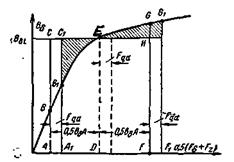 есть линейная нагрузка, условно показывающая нагрузку в амперах, приходящуюся на 1 см длины окружности якоря (I а/2 а — ток в проводнике обмотки). Рассматриваемая н.с. b dА действует по обходу, включающему воздушные зазоры, зубцы якоря, пути по ярму якоря и поперек полюса. Последними двумя магнитными сопротивлениями можно пренебречь и считать, что поперечная н.с. якоря изменяет лишь магнитные напряжения воздушных зазоров и зубцов. Поэтому используется "переходная" характеристика (рис. 5-26), представляющая собой зависимость B d = f [0,5(Fd + Fz)], (5-21) где B d = Ф/ b d l d — индукция в воздушном зазоре (расчетная длина по оси Под каждой половиной полюса действует н.с. якоря 0,5 bdA. Отложим 0,5 bdA вправо и влево от н.с., соответствующей индукции BdE. Последняя определяется по э.д.с. якоря