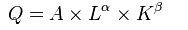 где Q — объем производства; L — труд; K — капитал; A — технологический коэффициент; α — коэффициент эластичности по труду; β — коэффициент эластичности по капиталу (α и β показывают степень эластичности изменения Q в зависимости от увеличения фактора на 1%, при условии, что другой фактор остается неизменен.)