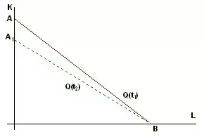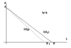 Очевидно, что с течением времени точка А остается на месте и изокванта смещается к началу координат при помощи поворота в положение AB1(рис. 6.15).