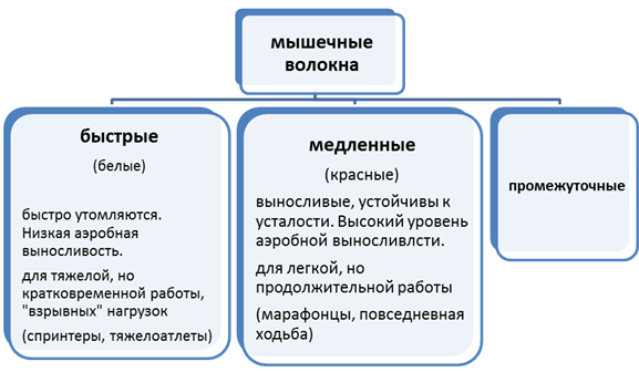 Отдельную (третью) группу мышц составляет сердечная поперечнополосатая (исчерченная) мышечная ткань (миокард). Она состоит из кардиомиоцитов. Сокращения сердечной мышцы не подконтрольны сознанию человека. В мышечной ткани содержится от 70% до 80% воды. Выделяют три основных вида мышечных волокон: - быстросокращающиеся - медленно сокращающиеся.