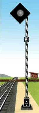 Не допускается совмещение светофоров прикрытия с другими светофорами. 26. Заградительными светофорами подается сигнал: один красный огонь – стой! Запрещается проезжать сигнал (рис. 48). Предупредительными светофорами перед заградительными подается сигнал один желтый огонь – разрешается движение с готовностью остановиться; основной заградительный светофор закрыт (рис. 49). Нормально сигнальные огни заградительных светофоров и предупредительных к ним не горят (рис. 50), и в этом положении светофоры сигнального значения не имеют. В отдельных случаях по решению владельца инфраструктуры или владельца железнодорожных путей необщего пользования могут применяться заградительные и предупредительные к ним светофоры с непрерывно горящими сигнальными огнями. Мачты заградительных светофоров имеют отличительную окраску – чередующиеся черные и белые наклонные полосы. Заградительные светофоры могут быть совмещены с маневровыми светофорами, в том числе карликового типа.