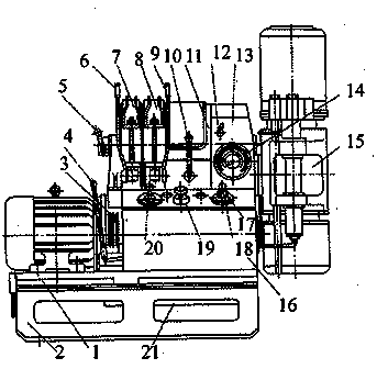 1 - станина;2 - рама;3 - зчеплення;4 - рукоятка зчеплення;5 - рукоятка включення лебідки;6, 9 - важелі гальм підйому і спуску;7,8 - гальма підйому і спуску;10 - важіль коробки передач;11 - лебідка; 12- рукоятка роздавальної коробки;13- трансмісія;14-покажчик тиску;15-обертач; 16 - гідросистема верстата з автоперехватом; 17 - дросель; 18 - прилад керування; 19 - регулятор подачі; 20 - розподільник; 21 - циліндр переміщення верстата. Рис. 2.1. Буровий верстат СКБ-4. На станині зібрані: електродвигун, коробка передач зі зчепленням від автомобіля ЗІЛ-131, роздавальна коробка з закріпленим на її фланці вращателем, лебідка, гальма спуску і підйому, маслонасос з індивідуальним електроприводом, пульт керування гідросистемою, маслобак, ручної маслонасос і циліндр переміщення верстата з гідрозамки. Станина встановлена на рамі, яка є підставою верстата, що з'єднуються з підставою бурової установки або яким-небудь іншим фундаментом за допомогою анкерних болтів. До особливостей верстата відносяться: висока частота обертання шпинделя і раціональний розподіл діапазону швидкостей; плавність подачі бурового інструменту з допомогою нової гідросистеми з напірним золотником і дроселем на зливі; можливість буріння снарядами зі знімним керноприемником (для чого збільшений діаметр прохідного отвору шпинделя); оснащення удосконаленою системою автоматичного перехоплення провідної труби в процесі буріння без зупинки обертання; установка покажчика тиску на вибій киловаттметра, які забезпечують достатню інформацію про технологічному процесі. У верстаті застосовані автомобільна коробка швидкостей і муфта зчеплення автомашини ЗІЛ-131, мають високу надійність.[1] Гідросистемою верстата СКБ-4 виконуються такі операції, що застосовуються в технологічному процесі буріння свердловин: 1) підйом, зупинка і опускання шпинделя обертача з буровим снарядом або без нього в межах робочого ходу циліндрів подачі; 2) робоча подача бурового снаряда при бурінні; 3) визначення ваги бурового снаряда і встановлення необхідного осьового навантаження на породоруйнуючий інструмент з можливістю її контролю за вказівником навантаження; 4) «разхаживание» бурового снаряда в свердловині; 5) переміщення верстата до свердловини або від свердловини з автоматичним закріпленням (стопоренням) його на рамі в крайніх або проміжних положеннях; 6) здійснення автоматичного або ручного перехоплення бурового снаряда в процесі буріння без зупинки обертання; 7) здійснення зворотного перехоплення бурового снаряда; 8) розкріплення верхнього гідропатрона без закріплення нижнього. При виконанні допоміжних робіт і в аварійних випадках підйом і опускання бурового снаряда, а також розкріплення верхнього патрона і переміщення верстата, можна проводити ручним маслонасосом. Автоматичне або ручне перехоплення бурового снаряда в про-цесі буріння являє собою технологічний цикл операцій, виконуваних гідросистемою автоматично без зупинки обертання шпинделя в наступній послідовності: а) при включенні перехоплення спочатку проводиться закріплення нижнього патрона, а потім розкріплення верхнього патрона і швидкий підйом траверси з розкріпленим верхнім набоєм; б) при відключенні перехоплення спочатку проводиться закріплення верхнього патрона, а потім розкріплення нижнього патрона і продовження робочої подачі, встановл