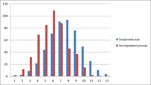 На графике представлена сравнительная гистограмма, показывающая расхождение между теоретической частотой попадания значений в соответствующие разряды n´ Рi и полученной в численном эксперименте Ni