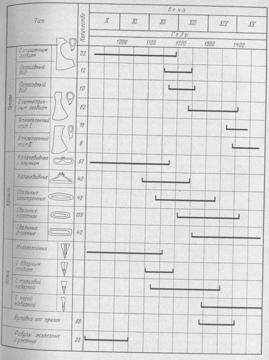 Ножи. Коллекция ножей насчитывает более 4500 экземпляров. Технологически и конструктивно они делятся на три типа и одну переходную форму (не считая функциональных различий). Самым древним и наиболее рациональным по конструкции был многослойный нож, у которого в середине клинка лезвия проходила стальная полоса (рнс. 4). Эти ножи имели клиновидное лезвие удлиненных пропорций и строгих очертаний, с доволъно широкой спинкой и массивной длинной рукояткой. Многослойные ножи изготовлялись в X и XI вв., в середине XII в. они вышли из употребления. В XII в. появился упрощенный вариант многослойного ножа. В нем стальную полосу вваривали лишь в нижнюю часть клинка. Эта переходная форма существовала недолго, и к концу XII в. ее вытеснил новый, «рационализированный» тип ножа с наварным торцовым лезвием. Нож этого типа имел широкое лезвие с тонкой спинкой и более короткую ручку, чем у ножа первого типа. Такие ножи дожили до середины XIV в., когда распространился новый, еще более упрощенный тип ножа с наварным косым лезвием. Ножи третьего типа бытовали в XIV и XV вв.