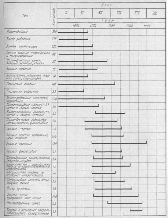 Бусы. Бусин из стекла, камня, металла и кости в нашей коллекцпи насчитывается около 4 тыс. Эта категория находок типологически и хронологически наиболее изменчива, так как кроме многих объективных условий, таких как связи с внешними центрами производства, а при местном изготовлепии — производственная база, технологические рецепты, сырье, на форму и качество бус влияла и мода. При достаточных статистических Данных бусы, как мы увидим ниже, могут быть надежной для хроиологических определепий категорией древностей.