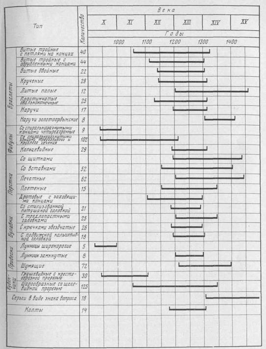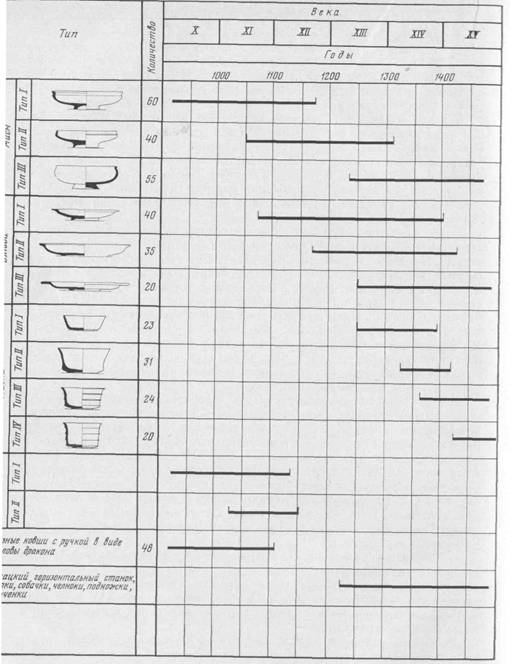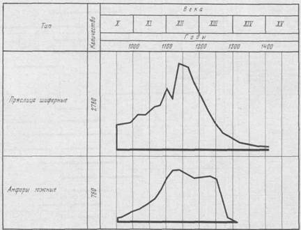 Рис. 8. Хронология массовых находок Б. А. Колчин гносится к слоям XII в., второй — только к слоям XIV—XV вв. Янтарные изделия появляются в Новгороде в первой четверти XI в. и бытуют о XV в. В XIII в. из-за отсутствия янтаря его обработка временно пре-ратилась: в слоях этого времени встречаются лишь единичные находки. Глиняные яйца-писанки, покрытые поливным узором из фигурных чобок, найдены в количестве 47. Такие писанки бытовали в Новгороде X—XI вв. ІІ до 80-х годов XII в., а затем исчезли. Рис. 9. Хронология шиферных пряслиц и амфор Пряслица из розового ІІ серого ніифера появились в Новгороде вместе первымп поселенцами. В XI в. привоз их в Новгород очень быстро Істет. Макспмальный привоз падает на середину XII в. После этого Ічинается спад, и уже к началу XIII в. количество их резко сокра-ается. К концу XIII в. они практически выходят из употребления.;его в этих слоях найдено 2780 пряслиц, из них 2470 из розового и 0 из серого шифера. В верхних ярусэх найдено еще 85 пряслиц Іис. 9). Амфоры поступали в Новгород в основном из городов Северного При-рноморъя. Это были болыние сосуды грушевидной формы с толстыми енками. Амфоры имели хороший обжиг, цвет глины колебался от ярко->асного до оранжевого. Встречались амфоры и других видов, особеыно Хронология новгородских древностей в слоях XII в. Например, на усадьбе художника Олисея Гречина в слоях второй половины XII в. найдены фрагменты тонкостенных амфор, при-везенпых пз Византии. Всего на раскопах Новгорода собрано более 760 хорошо определимых фрагментов амфор. Появились они в Новгороде во второй половине X в. и использовались до середины XIII в. Наиболь-шее количесіво амфор попало в Новгород в первой половнне XII в. Изделия из дерева. Огромное количество деревянных изделий, более 200 видов, бытовало в Новгороде без каких-либо существенных измепе-ний в продолжепие значительного времени. Многие виды деревянной утвари и хозяйственных и технических приспособлений дожилн до совре-менности. Лишь среди деревянной точеной и резной посуды можно выде-лить некоторые формы, употребление которых ограничепо узкими хроно-логическими рамками. К ним относятся отдельные виды мис, блюд, ложек (рис. 10). Мисы — большие нарядные глубокие сосуды на высоком поддоне, с вы-пуклыми стенками и фигурным венчиком — употреблялись как столовая посуда. По форме и размерам они делятся на три хронологических типа. Первый, рапний, тип включает мисы с раскинутыми выпуклыми стенками и венчиком округлой формы с перехватом. Диаметр сосудов 25—40 см, высота —9—12 см. Они были распространены в X и XI вв. Таких мис найдено более 60. Мисы второго типа значителъно меньше, профпль сте-нок и венчика упрощен. Они бытовали в основном в XII—ХТІІ вв. Их найдено более 40. Мисы третъего типа появляются в конце XIІТ в. н употребляются весь XIV в. Их форма еще более упрощается, приблп-жаясь к форме чаш, но фигурностъ венчика и высокий поддон сохра-няются. Таких мис найдеыо более 55. Блюда - плоские неглубокие сосуды с плавно раскинутымн стенкамн, широкими фигурными краями и плоским бортиком. Выделяется три хро-нологических типа. Блюда первого типа имели небольшой, отогнутый наружу венчнк с малепьким горизонтальным бортиком. Появляются эти сосуды в XI в. и продолжают бытовать до XIV в. Найдено более 40 блюд этого типа. В XIII в. появляются блюда второго типа, напоминающие по форме современную столовую глуб