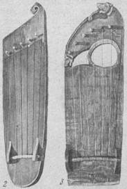 Рис. 3. Гусли XII и XIV вв. 1 — гусли XIV в. до реставрации; 2 — те же гусли (реконструкция); з — гусли с Тихвинского раскопа (реьонструкция) Может быть, к XIV в. в верхней деке новгородских гуслей и появи-лись отверстия, но пока археологами не будет найдено тому прямых до-казательств, восстанавливаемые инструменты не должны жметь от-верстий в деках. Что же касается изготовления традиционных гуслей для современноіг музыкальной практики, то мастера, изготовляющие инструменты, вправе-проводить на эту тему эксперименты и украшать отверстиями деки ин-струментов на свой вкус. Надо заметить только, что даже для поздних народных (этнографических) гуслей, да и для всех русских струнных инструментов — балалаек и домр — не характерны болыние, как принято-их называть, голосные отверстия. Гусли XII и XIII вв. Выбирая принциниальный путь для реконструк-цип шестиструнных гуселек XII в. и болыних девятиструнных гуслей Новгородские гудки и гусли XIII в., полезно еще раз провести обзор «гусельного ряда». Как ни похо-жи между собой инструменты второго и третьего периодов, но уже среди археологических гуслей наблюдаются некоторые (в общем плане, быть может, незначительные, но для работы по восстановлению важные) конструктивные различия. Во втором периоде два инструмента XIV в. по форме более других тяготеют к гуслям последующего, третьего периода и, вполне вероятно, полагают начало конструкции гуслей с окрылком, вынесенным за преде-лы линииколков (эта конструкциядожила до XX в.).Линия колков од-новременно ограничивает длину резонаторного ящика и длину струн. Звучащие струны получают отклик на частоты своих колебаний как от резонаторного ящика, так и от окрылка. Резонирующая площадь корпуса по отношению к длине струн получается увеличенной. Окрылок таких гуслей впоследствии нередко украшался геометрической резьбой. И с этой точки зрения один из инструментов XIV в. (6-8-1264) также объединяет-ся с этнографическими. Возможно, именно в XIV в. стало правилом из-готовлять верхнюю деку гуслей из легкой еловой древесины, что повлекло в свою очередь изменение конструкции струнодержателя. В связи с этим следует вспомнитъ, что при реконструкции пятиструнных гуслей XIV в. (8-11-1262) к корпусу инструмента по его акустическим данным потребо-ъалась легкая еловая дека. Чем же отличаются другие археологические инструменты от только что рассмотренных? Древнейшие из найденных — гуслиХІ,ХІІ,ХІП вв.— объединяются в одну группу характерным устройством окрылка с так называемым окном, расположенным между резонаторным ящиком и линией колков. В данных инструментах есть своя отличительная логика конструктивного построения, при котором преследуется задача максималь-но разъединить резонаторный ящик с колковой площадкой окрылка. Идеальный вариант логического построения этой конструкции подобен струнам, натянутым между разонатором и висящими в пространстве кол-ками (практически такая конструкция неосуществима). «Ножки», сое-диняющие колковую площадку с резонатором (как вынужденная необ-ходимость), выдерживают рабочее натяжение струн с запасом прочности, который определялся средневековыми мастерами опытным путем. Для художественного оформления рассматриваемых инструментов ха-рактерна резьба с изображением завитков растительного орнамента и некоторых элементов, присущих орнаментам-пл