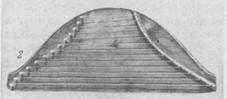 Рис. 4. Гусли 1 — девятиструнные (реконструкцня); 2 — шлемовидные Новгородские гудки и гусли нилось еще одним интересным экспонатом: это фрагмент накладки, предположительно от обложки рукописной книги, с изображением гусляра, ІІграющего на шлемовидных гуслях. Поза гусляра, форма инструмента, изобразительный язык — все говорпт о родстве этой на-кладки с буквицей Д из Новгородского служебника XIV в. Вот основные сведения о процессе изготовления шлемовидных гуслей. Корпус инструмента делается аналогпчно тому, как это было при строи-тельстве пятиструнных звончатых гуслеп XIV в., но с той разницей, что очертания резонаторного корытца и окрылка в целом напоминают шелоы-холм. Граница окончания резонаторного ящпка (корытца) проходит ря-доы с линией колковых отверстнй в окрылке. Бортики резонаторного ящика состругиваются на толщину верхнен деки, т. е. делаются попиже, прн этом колковая площадка около линпи основания инструмента закан-чивается прямоугольным крепежным выступом для будущей деки. Дека соответственно снабжается прямоугольным вырезом. Обе составные части инструмента изготовляются из еловой древесины. Из более^гвердой дре-весины — клена — делается струнодержатель: планка дугообразной фор-мы с маленышми отверстиями для закрепления в них струн. Струно-держатель всей плоскостью основания приклеивается к деке, а дека — к корпусу. Из древесины молодого (средней смолистости) можжевельника (применимы также многие другие породы деревьев) делаются колки, и инструмент оснащается струнами. Количество струн зависит от размеров инструмента, по этнографическим данным бывает до 36 струн. Сознавая условность изображенных в миниатюре из служебника 11 струн на гуслях, где размеры инструмента в руках гусляра требуют раза в два болыпего количества струн, тем не менее, была попытка оп-ределить минимальные, но вместе с тем принципиальные возможности и особенности шлемовидных гуслей. Реконструированный инструмент с га-баритными размерамп 665X254X60 мм имеет всего лишь 13 жильных струн. По тембровой окраске звуки гуслей напоминают арфу. Принципиальные различия между звончатыми крыловидными и шле-мовидными гуслями заложены в устройстве струнодержателя, количестве струн и приемах игры. Вибрация струн, пытающихся сорвать приклеенный к деке струнодер-жатель, непосредственно приводит в колебание саму деку. И хотя меха-ническая связь струн и деки в данном случае не так велпка, как, на-пример, в инструментах с подставками — гудке, балалайке, домре, все-такп она сказывается на силе звука ІІ тем самым позволяет оснащать шлемовидные гусли, в болыпей мере, чем крыловидные, жильными стру-нами. Благодаря болыпому колпчеству струн, диапазон звуков может до-стигать трех-четырех октав, что опять-таки сказывается на громкости инструмента. Жильные струны как материал не обладают звуконосностью металлических^ но при извлечении на шлемовидных гуслях звуков в од-ноп октаве аналогично настроенные струны в другпх октавах звучат как резонирующие и в результате усиливают и обогащают звучание каждой струны в отдельности и инструмента в целом. В. И. Поветкин Новгородский гудочек XIV в. Среди найденных на Неревском раско-пе лучковых (смычковых) инструментов гудочек XIV в. (9-9-1876) с точки зрения формальной реконструкции сохранился почти полностью 10. Хорошей сохранности