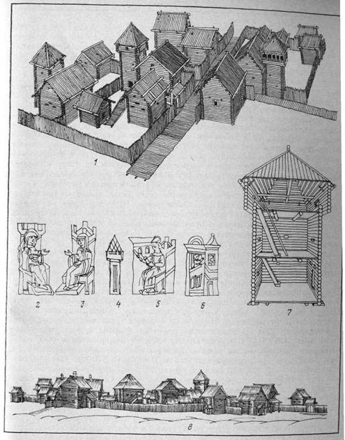 ков не обнаружены. Этот факт еще не говорит об отсутствии лавок, известных по письменным источникам. Он указывает на традиционно применяемую в народном зодчестве конструкцию, при которой они могли не сохраниться. Вполне возможно, что лавки рубились из брусьев значительной толщины, не требующих усиления и подпорок: «брусовая белая лавочка», как поется в одной из былин. В народном жилище XIX в. «лавки эти делаются из одной доски, и чем доска шире и ровнее обделана, тем лавка считается эффектнее» 20. Древнерусской избе с черным отоплением, помимо «дымных горестей», присущ еще один недостаток — обилие копоти, которая наполняла избу вместе с дымом и осаживалась жирными хлопьями на всех предметах. Нижняя часть избы на высоту вытянутой руки еженедельно прибиралась, а верхняя приобретала черный цвет, она прибиралась довольно редко. Над лавками, на высоте чуть выше роста человека, устраивались поли-цы — полки, которые в какой-то мере защищали лавки от копоти и служили для хранения домашнего инвентаря и припасов в корзинах, коробах и горшках. Полица в избе показана в клейме с Китоврасом на Васильевских вратах в Александровской слободе. В миниатюрах Радзивил-ловской летописи над прлицами показаны полки с подзорами — сыпухи (рис. 1). Изменение декоративных мотивов в порезках подзоров изучено достаточно полно (рис. 2). В Изборнике 1076 г. обличается богатый: «Всяко можеши аште хочеши. Несть бо тяжко, аште бо насытился еси пиштею накорми альчьпааго, напил ли ся еси, напои и жадьнааго и съгрел ли ся ели съгреи трясущегося зимою. В храме ли красьнеивысоце взлежищи: въведи скытаю-тааго ся по улицам в дом свой» 2i. Из контекста видно, что речь идет о богатых «красных» хоромах. В одной из изб хозяин «высоце взлежищи» — вероятно, на полатях. Полати могли иногда иметь ограждение. В раскопе часто попадаются фигурные доски, называемые в материалах Новгородской экспедиции «балясинами», с шипами с обеих сторон, причем с одной стороны шип гораздо больше. Большой шип вставлялся в глубокое гнездо, выдолбленное в бревне, второй шип держал только небольшой по сечению брус самого ограждения. Небольшая величина «балясин» свидетельствует о невысоком ограждении, которое было не частью «перенного» крыльца, а скорее всего ограждением полатей. Значительное углубление шипа доски в бревне свидетельствует о некоторых горизонтальных усилиях, которые могут возникать, например, при «взлазывании» на них. В народном зодчестве высота жилого помещения до потолка черных изб, как зафиксировано архитекторами и этнографами, обычно колебалась в пределах 3,20—3,75 м, но временами достигала 4,20 м из-за «технологии» отопления22. Часть же интерьера, используемая исключительно для хозяйственно-бытовых целей, была соразмерна росту человека, и здесь высота, как правило, ограничивалась 2,10—2,30 м. В холодных помещениях с потолком расстояние между полом и перекрытием составляло такую же величину. В избах с более совершенным отоплением «по-белому», с печью, имеющей каменную трубу, высота помещения была снижена до Рис. 2. Деревянные архитектурные детали и фрагменты 1 — декоративные мотивы подзоров и причелин 2 - отмостка перд входом (Б22Б) 3 - рундук (Е22А) 4- всход н тетивах (Е17И) 5 —крыльцо (Е128); 6 — «всход» на срубный рундук (Е24Ж) 7 - крыльцо на столбах (И10Г) 8 — план дворов X в. Неревского конца 9 - застройка X