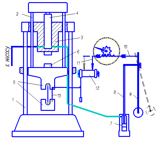 Кинематически машина представляет собой две сопряженные рамы: неподвижную – 1 и подвижную – 2. С неподвижной рамой жестко соединен гидравлический цилиндр 3. Подвижная рама через шарик опирается на плунжер 4. При подаче масла от насоса в цилиндр подвижная рама поднимается, и образец, установленный в захватах 5, будет испытывать срез. Если же образец установить между подушками 6, то он будет испытывать сжатие. Для измерения нагрузки служит силоизмерительное устройство. Цилиндр 7 силоизмерителя соединен трубкой с цилиндром 3. Поэтому в обоих цилиндрах будет одинаковое давление. Плунжер силоизмерителя через тягу 8 отклоняет маятник 9 с грузом от вертикали. Отклонение маятника будет пропорционально давлению в цилиндрах 7 и 3 и, следовательно, пропорционально усилию в образце. Верхний конец маятника при отклонении ведет рейку 10, которая через зубчатое колесико приводит в движение рабочую стрелку силоизмерителя. В зависимости от числа сменных грузов, устанавливаемых на маятнике, шкала силоизмерителя имеет три диапазона измерения нагрузки: 0÷100 кН, 0÷200 кН, 0÷500 кН.