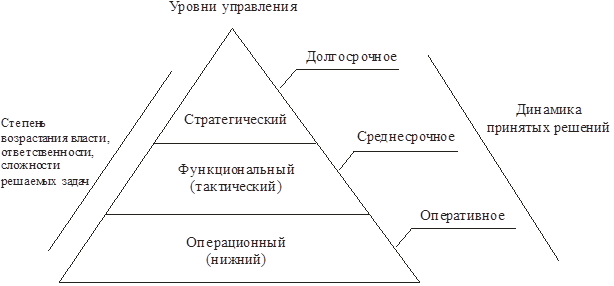 Координация работы всех подразделений организации осуществляется через органы управления разного уровня. Под управлением понимают обеспечение поставленной цели при условии реализации следующих функций: организационной, плановой, учетной, анализа, контрольной, стимулирования. Рассмотрим содержание управленческих функций. o Организационная функция заключается в разработке организационной структуры и комплекса нормативных документов: штатного расписания фирмы, отдела, лаборатории, группы и т.п. с указанием подчиненности, ответственности, сферы компетенции, прав, обязанностей и т.п. Чаще всего это излагается в положении по отделу, лаборатории или должностных инструкциях. o Планирование (плановая функция) состоит в разработке и реализации планов по выполнению поставленных задач. Например, бизнес-план для всей фирмы, план производства, план маркетинговых исследований, финансовый план, план проведения научно-исследовательской работы и т.д. на различные сроки (год, квартал, месяц, день). o Учетная функция заключается в разработке или использовании уже готовых форм и методов учета показателей деятельности фирмы: бухгалтерский учет, финансовый учет, управленческий учет и т.п. В общем случае учет можно определить как получение, регистрацию, накопление, обработку и предоставление информации о реальных хозяйственных процессах. o Анализ или аналитическая функция связывается с изучением итогов выполнения планов и заказов, определением влияющих факторов, выявлением резервов, изучением тенденций развития и т.д. Выполняется анализ разными специалистами в зависимости от сложности и уровня анализируемого объекта или процесса. Анализ результатов хозяйственной деятельности фирмы за год и более проводят специалисты, а на уровне цеха, отдела ≈ менеджер этого уровня (начальник или его заместитель) совместно со специалистом-экономистом. o Контрольная функция чаще всего осуществляется менеджером: контроль за выполнением планов, расходованием материальных ресурсов, использованием финансовых средств и т.п. o Стимулирование или мотивационная функция предполагает разработку и применение различных методов стимулирования труда подчиненных работников: o финансовые стимулы - зарплата, премия, акции, повышение в должности и т.п.; o психологические стимулы - благодарности, грамоты, звания, степени, доски почета и т.п. В последние годы в сфере управления все активнее стало применяться понятие "принятие решения" и связанные с этим понятием системы, методы, средства поддержки принятия решений. Принятие решения - акт целенаправленного воздействия на объект управления, основанный на анализе ситуации, определении цели, разработке программы достижения этой цели. Структура управления любой организации традиционно делится на три уровня: операционный, функциональный и стратегический. Уровни управления (вид управленческой деятельности) определяются сложностью решаемых задач. Чем сложнее задача, тем более высокий уровень управления требуется для ее решения. При этом следует понимать, что более простых задач, требующих немедленного (оперативного) решения, возникает значительно большее количество, а значит, и уровень управления для них нужен другой - более низкий, где принимаются решения оперативно. При управлении необходимо также учитывать динам