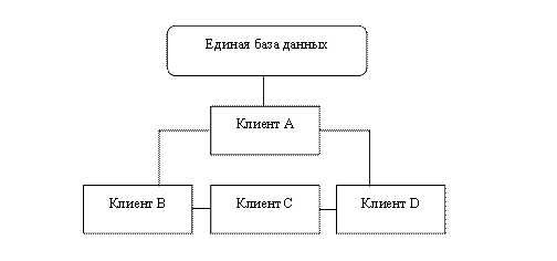 Рис. 4. Стратегия централизации распределения данных При распределении данных на основе стратегии расчленения база данных распределяется по многим узлам сети, но существование копий отдельных частей базы данных не допускается. База данных разделяется на непересекающееся подмножества (логические фрагменты) и каждый логический фрагмент размещается в отдельном узле. Объем базы данных ограничивается объемом вторичной памяти, имеющейся во всей сети, анне в единственном узле [4]. Эффективность стратегии расчленения тем выше, чем выше степень локализации ссылок, то есть чем больше число запросов пользователей реализуется в базах данных соответствующих локальных информационных систем (рис.5).