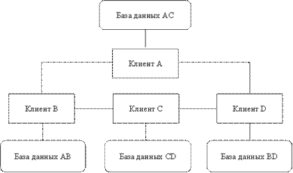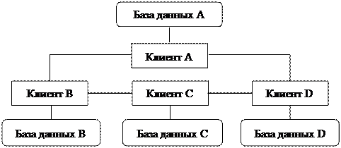 Рис. 6. Стратегия дублирования распределения данных Смешанная стратегия распределения данных (рис. 7) объединяет подходы, связанные с расчленением и дублированием данных с целью приобретения преимуществ, которыми они обладают. Эта стратегия подразделяет базы данных на логические фрагменты, как это делается в стратегии расчленения, но в дополнение к этому дает возможность иметь произвольное количество физических копий каждого фрагмента, называемых хранимыми фрагментами.