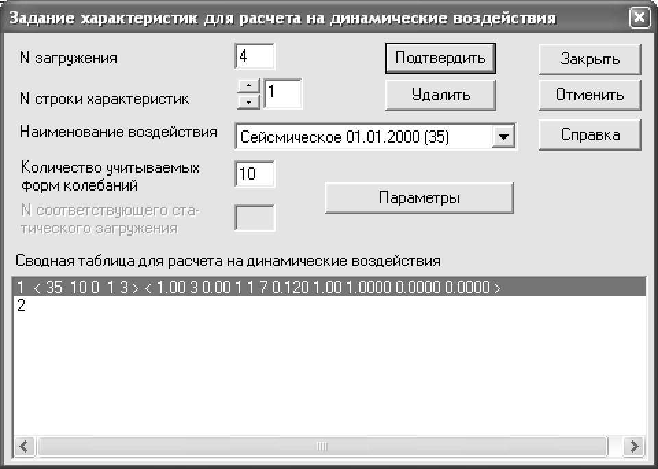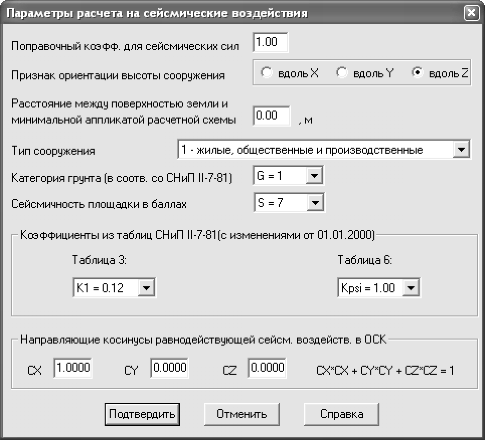 § направляющие косинусы равнодействующей сейсм. воздейств. в ОСК (основной системе координат)– CX = 1. § остальные параметры примите заданными по умолчанию. Ø Подтвердите ввод данных, щелчком по кнопке Подтвердить. Ø Щелкните по кнопке Закрыть в диалоговом окне Задание характеристик для расчета на динамические воздействия.