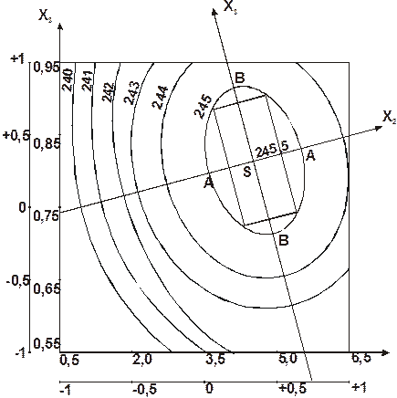 Координаты нового центра в старых осях координат в точке S(4,58; 0,81). Производится поворот осей координат в точке 0 на величину угла Построение линий равного значения отклика осуществляется в новой системе координат При