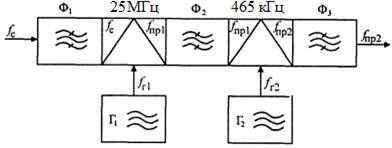 Проектируемый приемник будет построен по супергетеродинной схеме с двойным преобразованием частоты (инфрандинный тип приемника). Схемы инфрандинного приемника применяются для более эффективной борьбы с зеркальным каналом приема. В инфрадинном приемнике первая промежуточная частота выбирается выше самой верхней частоты диапазона принимаемых сигналов. При этом зеркальный канал отодвигается настолько далеко от основного, что легко подавляется самыми простыми фильтрами [6]. В схеме супергетеродина с двойным преобразованием частоты перестраиваемым выполняется только первый гетеродин. В качестве такого гетеродина обычно применяется синтезатор дискретной сетки частот. Второй гетеродин может быть выполнен на фиксированную частоту. Это позволяет фильтр промежуточной частоты рассчитать на фиксированное значение, тем самым упростив его реализацию [7]. Преимущество инфрадина состоит в упрощении преселектора. В приемнике с переменной настройкой в широком диапазоне частот этот фильтр нежелателен, так как он требует плавной настройки в поддиапазоне и переключения катушек для смены поддиапазонов. В инфрадинном приемнике канал прямого прохождения и зеркальный канал приема лежат выше верхней частоты принимаемого сигнала, что позволяет использовать в качестве фильтра не перестраиваемый ППФ Салена - Кея с единичным усилением. Предварительная структурная схема инфрандинного приемника приведена на рис.1.1