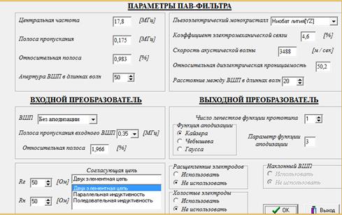 С помощью программной среды "Расчет ПАВ фильтров" проектирую фильтр с необходимыми мне параметрами. В окно "Параметры ПАВ фильтра" ввожу необходимые для расчета данные