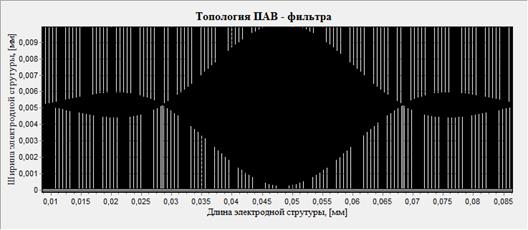 После ввода необходимых данных, запускаю проектирование структуры ПАВ фильтра. Структура полученного ПАВ фильтра привожу на рис. 2.10