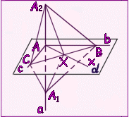 Доказательство:Пусть а прямая, перпендикулярная прямым b и c в плоскости . Тогда прямая а проходит через точку А пересечения прямых b и c. Докажем, что прямая а перпендикулярна плоскости . Проведем произвольную прямую х через точку А в плоскости и покажем, что она перпендикулярна прямой а. Проведем в плоскости произвольную прямую, не проходящую через точку А и пересекающую прямые b, c и х. Пусть точками пересечения будут В, С и Х. Отложим на прямой а от точки А в разные стороны равные отрезки АА1 иАА2. Треугольник А1СА2 равнобедренный, так как отрезок АС является высотой по условию теоремы и медианой по построению (АА1=АА2). по той же причине треугольник А1ВА2 тоже равнобедренный. Следовательно, треугольники А1ВС и А2ВС равны по трем сторонам. Из равенства треугольников А1ВС и А2ВС следует равенство углов А1ВХи А2ВХ и, следовательно равенство треугольников А1ВХ и А2ВХ по двум сторонам и углу между ними. Из равенства сторон А1Х и А2Х этих треугольников заключаем, что треугольник А1ХА2 равнобедренный. Поэтому его медиана ХА является также высотой. А это и значит, что прямая х перпендикулярна а. По определению прямая а перпендикулярна плоскости . Теорема доказана.