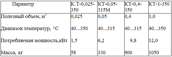 Для воспроизводимости результатов испытаний камеры тепла имеют следующие конструктивные особенности. Внутренние стенки выполняют из материала, имеющего степень черноты не менее 0,82...0,85. Температура стенок тепловой камеры не должна отличаться от задаваемой больше чем на 3 %, что ограничивает влияние излучения от стенок. Испытываемые образцы изделий не должны испытывать прямого влияния тепла от тэнов. Точность поддержания температуры в полезном объеме камеры не должна быть ниже 3 °С. Относительная влажность перед испытаниями внутри камеры должна быть 50 % при температуре 35 °С. Минимально допустимое расстояние между испытываемым изделием и стенкой тепловой камеры не должно быть меньше 100 мм. Применяемые для крепления малогабаритных изделий материалы должны обладать высокой теплостойкостью и низкой теплопроводностью. Для испытаний на воздействие повышенной температуры применяются камеры тепла, техническая характеристика которых представлена в таблице 5.1. Получение необходимой температуры в тепловой камере достигается с помощью циклического включения и выключения тэнов в зависимости от устанавливаемой температуры испытаний. Для измерения и автоматического регулирования температуры в камере применяют электронные мосты и автоматические электронные потенциометры. Широко используют микропроцессорную технику и вывод информации на персональный компьютер, и цифровое информационное табло. В качестве чувствительного элемента используют р — n– переход, медные и платиновые сопротивления.
