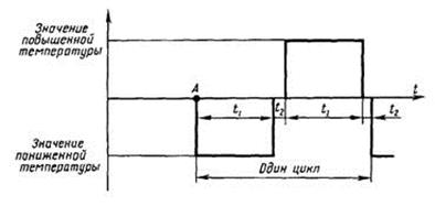 Испытание проводят в двух ваннах с водой, с одной из которых вода имеет пониженную, а в другой повышенную температуру, соответствующие испытательным режимам. Конструкция ванны должна обеспечивать легкое погружение и быстрое перемещение изделий из одной ванны в другую и поддерживать испытательные режимы с отклонениями. Испытание проводят без подачи на изделия электрической нагрузки. Перед погружением в ванну изделия выдерживают в нормальных климатических условиях испытаний в течение времени, установленного в стандартах и ТУ на изделия. Визуальный осмотр и проверку изделий проводят в соответствии с требованиями стандартов и ТУ на изделия. Изделия подвергают воздействию 10 циклов, если иное число не указано в стандартах и ТУ на изделия. Каждый цикл состоит из следующих этапов: а) изделия погружают в ванну с холодной водой, температура которой 0°С, и выдерживают в течение времени, указанного в стандартах и ТУ на изделия. Температура воды в процессе выдержки не должна повышаться больше чем на 2°С. б) изделия переносят в ванну с кипящей водой или водой, имеющей повышенную температуру, установленную в стандартах и ТУ на изделия, выдерживают в течение времени, указанного в стандартах и ТУ на изделия. Время переноса устанавливают в стандартах и ТУ на изделия. Температура в ванне вовремя испытания не должна падать ниже 95°С или более чем на 2°С от значения, установленного в стандартах и ТУ на изделия. В случае необходимости проведения испытаний при других крайних значениях температур допускается применять другие жидкости, характеристики которых указывают в стандартах и ТУ на конкретные изделия. Совокупность операций составляет один испытательный цикл, график которого показан на рисунке 7.3.