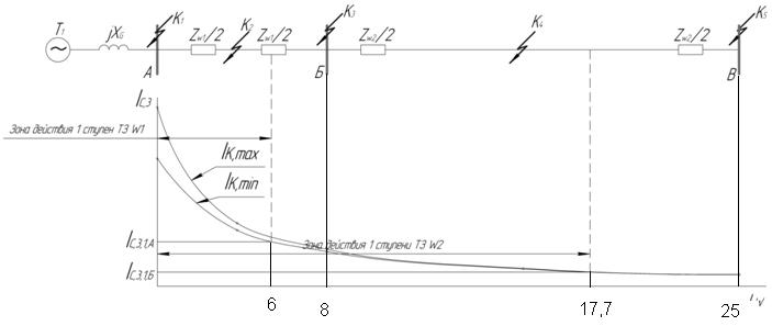 Цель работы: Изучить особенности расчета параметров срабатывания и построения карты селективности двухступенчатых токовых защит линий электропередачи (ЛЭП) радиальной сети с односторонним питанием. Задание: по исходным данным для приведенной схемы выполнить расчет параметров срабатывания токовых защит ЛЭП в следующей последовательности: 1. Определить нагрузочные токи ЛЭП (рис.2). 2. Выбрать коэффициенты трансформации трансформаторов тока ТА1, ТА2. 3. Составить схему замещения сети и рассчитать сопротивления ее элементов в именованных единицах. 4. Найти максимальные и минимальные токи КЗ в начале, середине и конце линий W1, W2 в точках К1 – К5 (принять сопротивление питающей системы в минимальном режиме работы xGmin=1,4 xGmax). Результаты расчетов свести в таблицу. 5. Рассчитать токи срабатывания отсечек без выдержки времени (первых ступеней токовых защит) ЛЭП W1, W2. 6. Рассчитать токи срабатывания реле (уставки) отсечек ЛЭП W1, W2 при условии, что схемы соединения вторичных обмоток трансформаторов тока – звезда. 7. Проверить чувствительность отсечек ЛЭП W1, W2. 8. Графически определить зоны действия отсечек ЛЭП W1, W2 в минимальном режиме работы системы. 9. Рассчитать токи срабатывания максимальных токовых защит (третьих ступеней токовых защит) ЛЭП W1, W2. 10. Рассчитать токи срабатывания реле (уставки) МТЗ ЛЭП W1, W2. 11. Определить времена срабатывания МТЗ ЛЭП W1, W2. 12. Проверить чувствительность МТЗ ЛЭП W1, W2 в основной и резервной зонах.