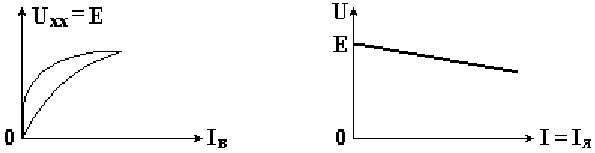 Зависимость ЭДС генератора от тока возбуждения называется характеристикой холостого хода E = Uхх = f (Iв). Характеристику холостого хода получают при разомкнутой внешней цепи (Iя) и при постоянной частоте вращения (n2 = const) Характеристика холостого хода генератора показана на рис. 11.8. Из-за остаточного магнитного потока ЭДС генератора не равна нулю при токе возбуждения, равном нулю. При увеличении тока возбуждения ЭДС генератора сначала возрастает пропорционально. Соответствующая часть характеристики холостого хода будет прямолинейна. Но при дальнейшем увеличении тока возбуждения происходит магнитное насыщение машины, отчего кривая будет иметь изгиб. При последующем возрастании тока возбуждения ЭДС генератора почти не меняется. Если уменьшать ток возбуждения, кривая размагничивания не совпадает с кривой намагничивания из-за явления гистерезиса. Зависимость напряжения на внешних зажимах машины от величины тока нагрузки U = f (I) при токе возбуждения Iв = const называют внешней характеристикой генератора.