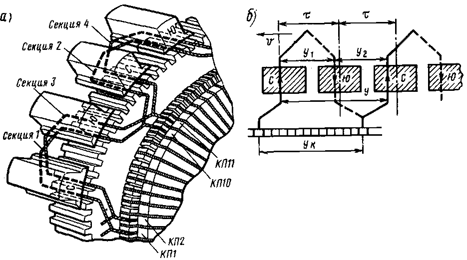 Простая волновая обмотка. При простой волновой обмотке секции, лежащие под разными полюсами, соединяют последовательно (рис. 94). При этом после одного обхода окружности якоря, т. е. после последовательного соединения р секций приходят к коллекторной пластине, расположенной рядом с исходной. Например, начало секции 1 присоединяют к коллекторной пластине КП1, а ее конец соединяют с коллекторной пластиной КП10 и началом секции 2, которая расположена под следующей парой полюсов; затем конец секции 2 соединяют с другой коллекторной пластиной и с началом