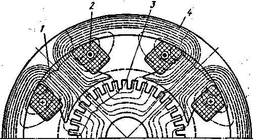 Рис. 8.21. Магнитное поле машины постоянного тока в режиме холостого хода: 1 — полюс; 2 — обмотка возбуждения; 3 — якорь; 4 — корпус (станина)