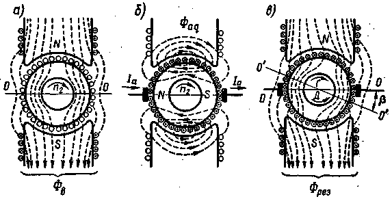 Рис. 8.23. Характер магнитного поля машины постоянного тока,: создаваемые обмоткой возбуждения (а), обмоткой якоря (б)и результирующего поля (в)