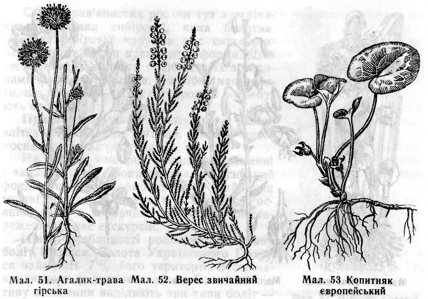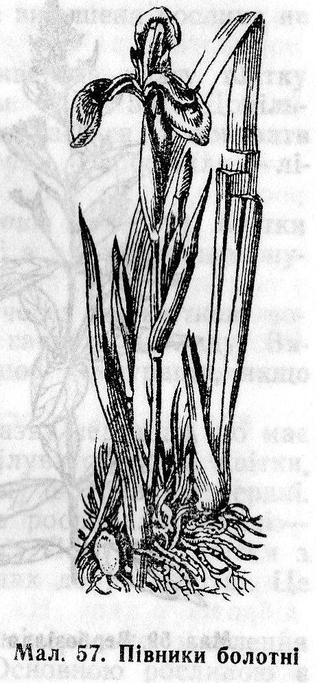 Цікаві особливості рослинного покриву боліт Полісся. Болота Українського Полісся займають 7 % його території. Зустрічаються вони у заплавах річок. Залежно від типу живлення виділяють три типи боліт — низинні, перехідні і верхові. Низинні болота, до яких належить 94 %, розвиваються за умов багатого мінерального живлення і мають різноманітний флористичний склад. Тут росте багато рослин водойм — очерет, рогіз, комиш, осоки, їжачі голівки тощо. Увагу дітей можуть привернути такі гарні рослини, як півники болотні, вовче тіло болотне, образки, вербозілля, гравілат, пухівки, бобівник трилистий, білозір болотний. Півники болотні (мал. 57) з яскраво-жовтими квітками — гарна декоративна рослина, яка має лікарські властивості. Вовче тіло болотне цвіте темно-червоними квітками, схожими на зірочки. Увагу дітей можна звернути на гарні перисті листки, неначе вирізані по краях зубчиками. Це лікарська рослина. Образки болотні (мал. 58) нагадують дітям кімнатну рослину калу. Біле покривало з жовтим початком виглядає особливо гарно в оточенні стрілоподібного зеленого листя. Слід сказати дітям, що образки — отруйна рослина, його не їдять тварини, але висушена рослина не отруйна. Вербозілля звичайне — рослина, що привертає увагу влітку гарним золотавим пірамідальним суцвіттям (мал. 59). Доцільно запитати у дітей, чому рослина так називається, і показати подібність листків вербозілля до листків верби. Вербозілля — лікарська і декоративна рослина. Зустрічається на болотах і гравілат річковий (мал. 60). Квітки в нього дзвоникоподібні, пелюстки жовтуваті з оранжево-червонуватими жилками. Гравілат — лікарська рослина. Пухівка піхвова (мал. 61) названа так через приквіткові волоски, які надають рослині після цвітіння гарного вигляду. Використовують пухівки для набивання подушок і матраців, якщо немає інших матеріалів.