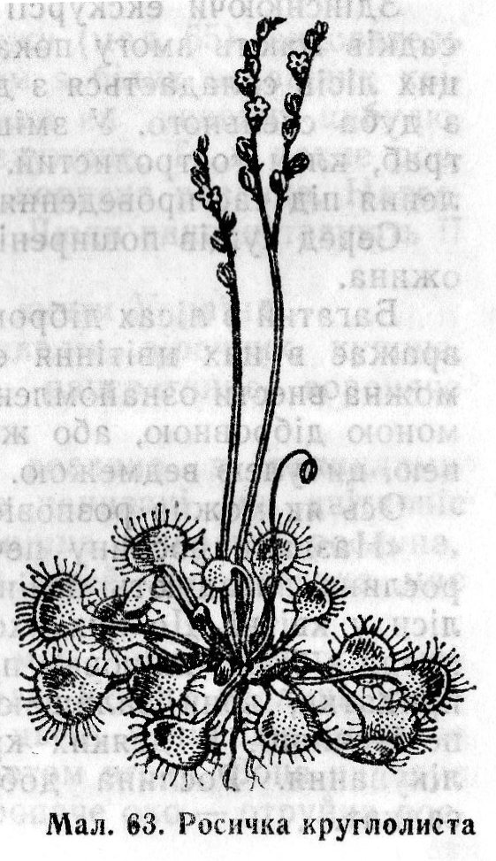 На верхових болотах зустрічається росичка кругло листа (мал. 63). Це маленька рослина з округлими листками, що вкриті волосками з крапельками, подібними до роси. Звідси і назва — росичка. Це комахоїдна рослина. Коли комаха сідає на липкий листок росички, вона прилипає до нього. Тоді листочок згортається і клійка рідина, що виділяється залозками, заливає комаху. У рідині є речовини, які перетравлюють м'які частини комахи, перетворюючи їх у речовини, доступні для засвоєння рослиною. Так росичка добуває для себе азотисті речовини, яких мало за умов торф'яного болота. Росичка — лікарська рослина. Зараз вона стала рідкістю і тому занесена до Червоної книги України. Date: 2015-07-24; view: 1411; Нарушение авторских прав |