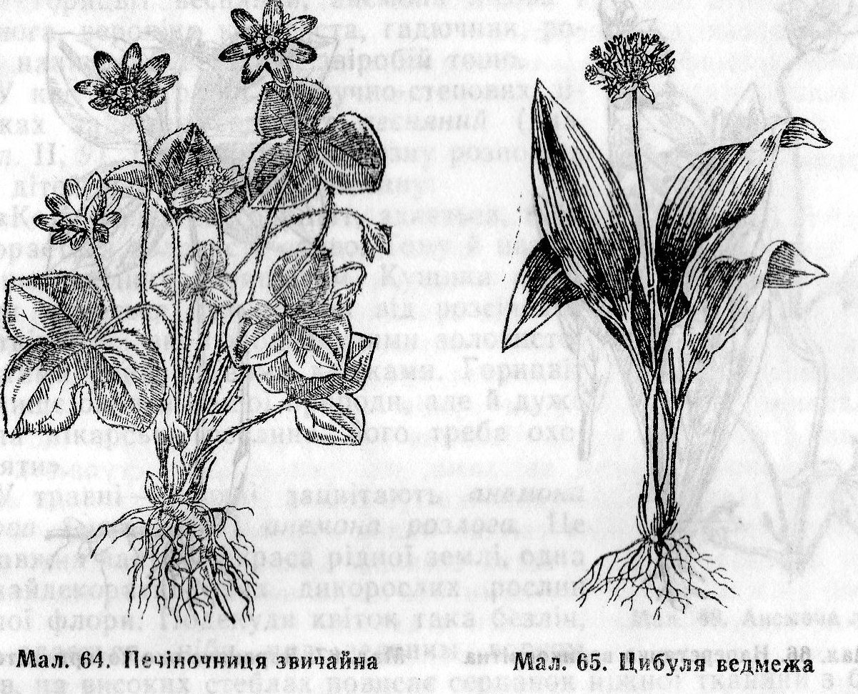 Серед кущів поширені ліщина, глід, бруслина, калина, малина, ожина. Багатий в лісах дібровного типу трав'янистий покрив. Особливо вражає в них цвітіння ефемероїдів. Навесні в зміст екскурсій можна внести ознайомлення дітей з підсніжником, проліскою, анемоною дібровною, або жовтецевою, рястом, медункою, печіночницею, цибулею ведмежою. Ось як можна розповісти про печіночницю звичайну (мал. 64): «Назвали рослину печіночницею тому, що за формою листки рослини нагадують печінку. Синьо-блакитні квітки прикрашають ліси у квітні. До них охоче прилітають комахи. А після цвітіння плоди з білим жировим придатком розтягують мурашки. Поїдаючи придатки, вони залишають насіння і тим сприяють поширенню печіночниці. В деяких країнах печіночницю використовують для лікування. Рослина добре приживається на ділянці дитячого садка». Розповідаючи дітям про цибулю ведмежу (мал. 65), вихователь відзначає, що вона цвіте навесні зонтиком з білих запашних квіток, її листя на довгих черешках не схоже на звичайну цибулю, воно досить широке, плоске, на кінцях звужене. Та й пахне рослина часником. Ведмежа цибуля — дуже корисна рослина. Навесні вона приваблює бджіл своїм нектаром. Люди використовують її в їжу та лікуються нею. Ведмежу цибулю внесено до Червоної книги України. У травні увагу дітей привернуть конвалія, зірочник, купина, веснівка. У червні — вероніка дібровна, наперстянка, вороняче око тощо.