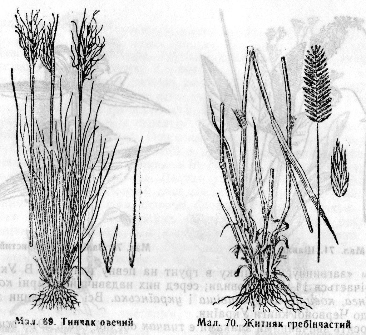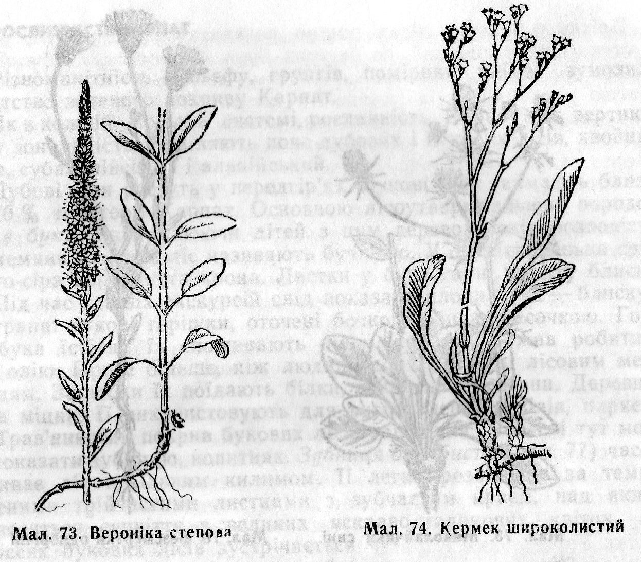 В Україні зустрічається 14 видів ковили; серед них надзвичайно гарні ковила Лессінга, ковили найкрасивіша і українська. Всі ці рослини занесено до Червоної книги України. Досить звичайними злаками є типчак овечий (мал. 69) і житняк гребінчастий (мал. 70). Вони мають щетиноподібні листки, через не їм не страшна літня спека. Ці злаки вважаються найкращими пасовищно-кормовими рослинами степу. Наприкінці травня і в червні степ буває особливо барвистим. Виділяється яскраво-білими квітками з приємним запахом свіжого меду катран. На одній рослині квіток так багато, що вона нагадує білу хмаринку, що опустилася на землю. Цікаво відзначити, що катран — їстівна рослина, можна вживати листки і стебла з бутонами, які на смак нагадують капусту. З квіток катрану бджоли збирають нектар. У червні увагу дітей можна привернути до цвітіння шавлії пониклої (мал. 71). її сині китиці квіток звисають вниз, наче сумуючи. Шавлія — медоносна і лікарська рослина. Цікавим об'єктом спостережень є залізняк бульбистий (мал. 72). Це досить висока рослина з міцним чотиригранним стеблом, яка чітко вимальовується серед степового різнотрав'я. Цвіте бруднувато-рожевими квітками, що нагадують ротики. Залізняк — медоносна рослина. Надзвичайно прикрашають степ у червні волошки руські. Незвичайні лимонно-жовті кошики квіток волошки високо піднімаються над степовим різнотрав'ям. Вони приваблюють до себе бджіл, тому є цікавими для спостережень. Окрасою степів є також вероніка степова (мал. 73), яка цвіте яскравими синіми дрібними квітками, зібраними у густу виструнчену китицю. В червні починає цвісти в степах льон австрійський. Під час масового цвітіння степові схили стають ніжно-блакитними. Особливо це виявляється вранці, бо вже всередині дня пелюстки льону опадають, а вранці розкриваються нові квітки. Увагу дошкільників слід звернути на те, що це рослина-барометр. У вологу і дощову погоду квітки льону зовсім не відкриваються. Від цвітіння різноманітних рослин степ наповнюється чудовими пахощами. Від сходу до заходу сонця над квітами гудуть джмелі, дикі і свійські бджоли, поспішаючи скористатися буйним степовим різнотрав'ям. У липні яскравість степів різко зменшується. Більшість степових рослин відцвітає вже в середині місяця. І все ж цікавими рослинами в цей час є рослини, які об'єднують у групу перекотиполя. До них належать кермек, лещиця, миколайчики, гоніолімон. У всіх цих рослин міцна коренева система, заглиблена у грунт; вони добре пристосовані до нестачі вологи. В липні можна показати, як цвіте фіолетовими квітками кермек широколистий.